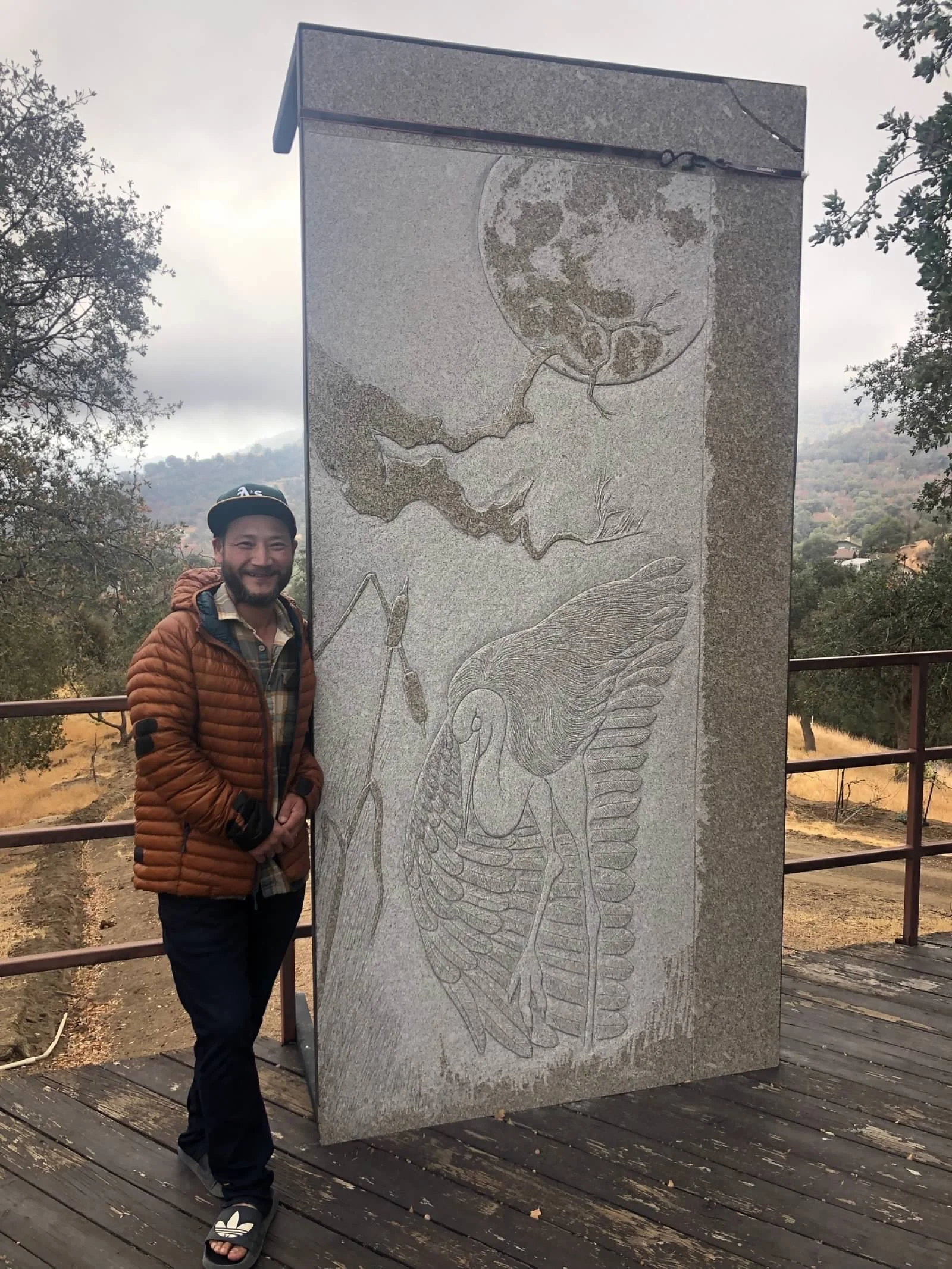 Heron and Moon (with the artist), May 2021. Granite, 7' x 4'